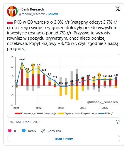 – PKB Polski w III kwartale wzrósł o 3,8% r/r (minimalnie szybciej niż w pierwszym szacunku), ale jego struktura znowu zaskakuje: konsumpcja prywatna wzrosła jedynie o 3,5% (miało być 4,5% r/r) konsumpcja publiczna dołożyła 1,5 pkt proc. do wzrostu, nie wiadomo za bardzo, dlaczego inwestycje wzrosły aż o 7,1% r/r, zostawiając w tyle produkcję budowlaną, nakłady firm 50+ i samorządów, itp.; werdykt – zbrojenia eksport i import wzrosły o 6% r/r – niezły wynik przy słabym popycie głównych partnerów handlowych PL. Te dane nie zmieniają całorocznej prognozy (3,6% w 2025 r.), ale powinny nieznacznie przesunąć akcenty. Więcej inwestycji, mniej konsumpcji – podsumowują dane ekonomiści banku Pekao SA.