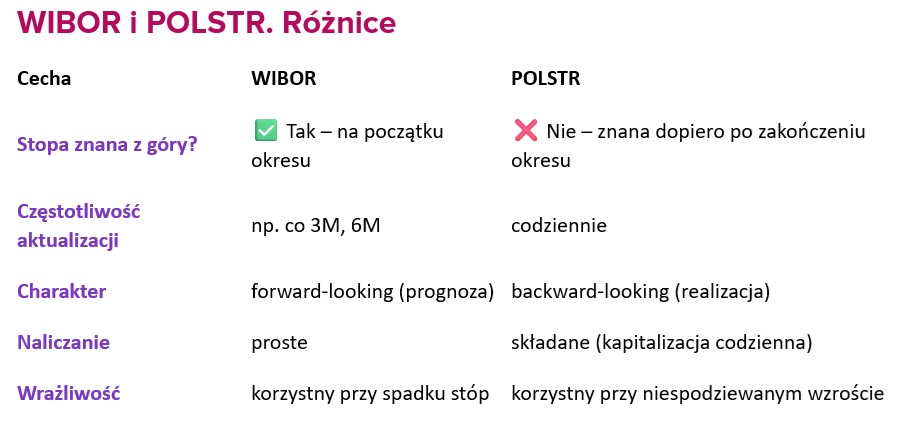WIBOR to wskaźnik forward-looking – oparty na deklaracjach banków, po jakiej stopie udzieliłyby pożyczek w przyszłości. POLSTR to wskaźnik backward-looking – obliczany na podstawie faktycznych transakcji overnight. Kupon od obligacji oparty na WIBOR ustala się na początku okresu odsetkowego i jest znany z góry. W przypadku POLSTR kupon jest sumą codziennych stóp i znany jest dopiero w dniu wypłaty.