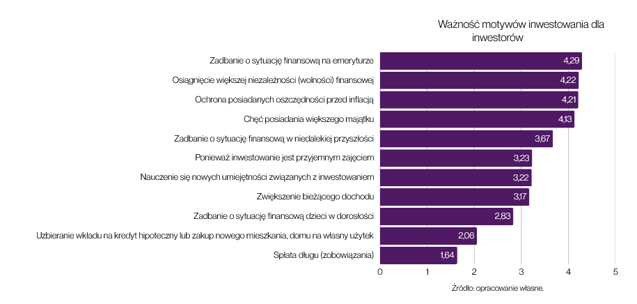 Najważniejszymi spośród 11 powodów inwestowania są: zadbanie o sytuację finansową na emeryturze (ocena średnia 4,29 na 5-stopniowej skali), osiągnięcie większej niezależności finansowej (4,22), ochrona oszczędności przed inflacją (4,21), chęć posiadania większego majątku (4,13).