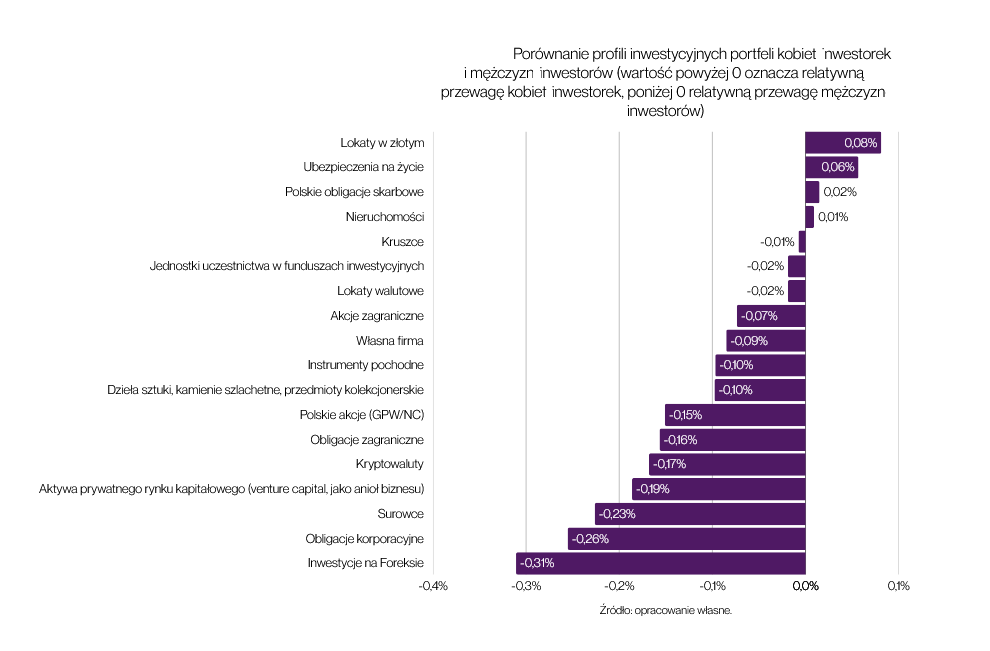 Portfele inwestycyjne kobiet inwestorek nieco częściej opierają się o bezpieczniejsze aktywa (obligacje skarbowe, lokaty, ubezpieczenia na życie), a rzadziej o aktywa bardziej ryzykowne (polskie i zagraniczne akcje, obligacje zagraniczne i korporacyjne, kryptowaluty, surowce, inwestycje na foreksie).