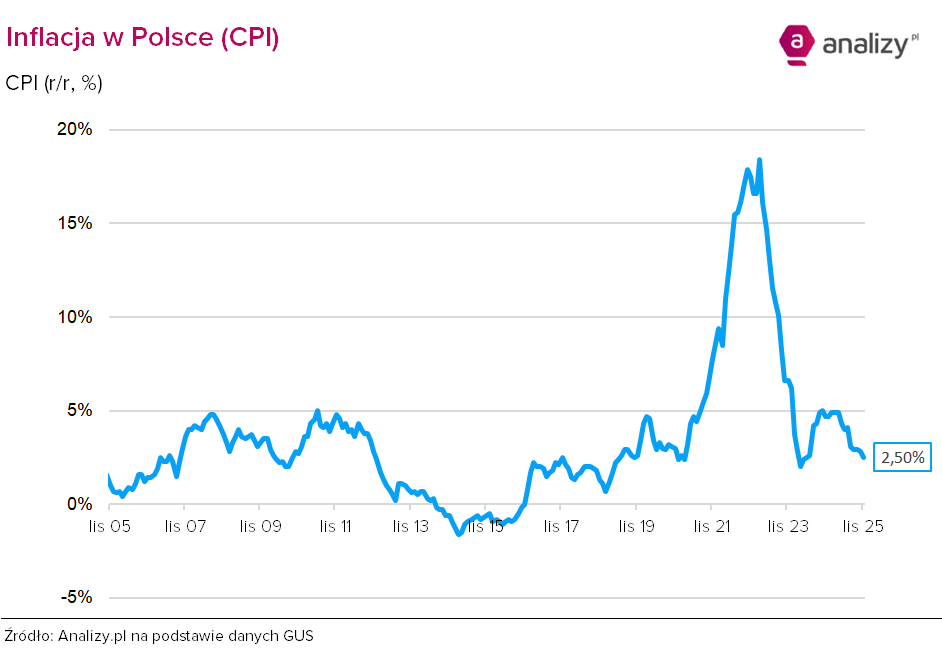 Inflacja w listopadzie spadła do 2,5% z 2,8% w październiku. To minimalnie więcej, niż podał GUS we wstępnym szacunku, ale mniej, niż wynosiła pierwotna prognoza. Listopadowy odczyt znajduje się dokładnie w celu Narodowego Banku Polskiego.