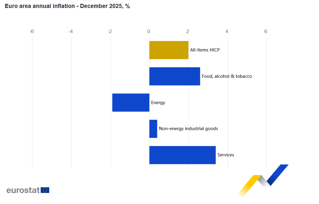 Według wstępnych szacunków Eurostatu, urzędu statystycznego Unii Europejskiej, roczna inflacja w strefie euro wyniosła 2,0% w grudniu 2025 r., w porównaniu z 2,1% w listopadzie.