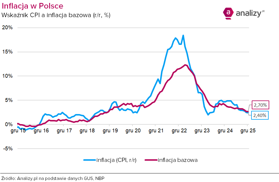 Narodowy Bank Polski opublikował 16 stycznia 2026 r. komunikat o wskaźnikach inflacji bazowej w grudniu 2025 r. W relacji rok do roku inflacja: