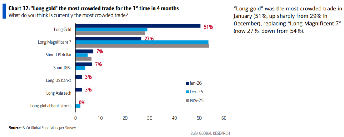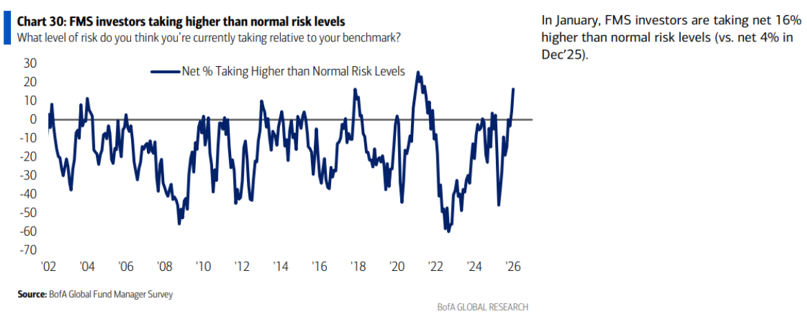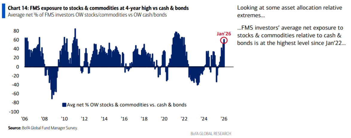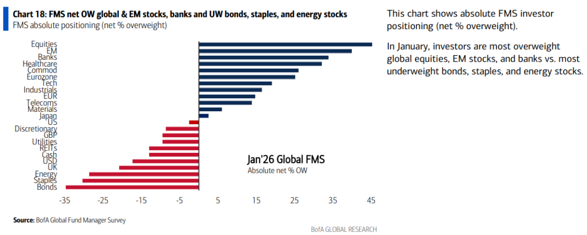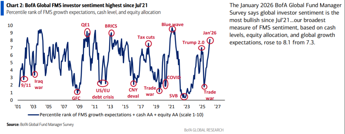 W styczniu 2026 roku ankietowani przez BofA zarządzający (badanie przeprowadzono wśród 227 instytucjonalnych zarządzających funduszami, którzy w portfelach mają aktywa o łącznej wartości 646 miliardów dolarów) wykazali się najbardziej optymistycznym nastawieniem do rynku od czterech i pół roku.