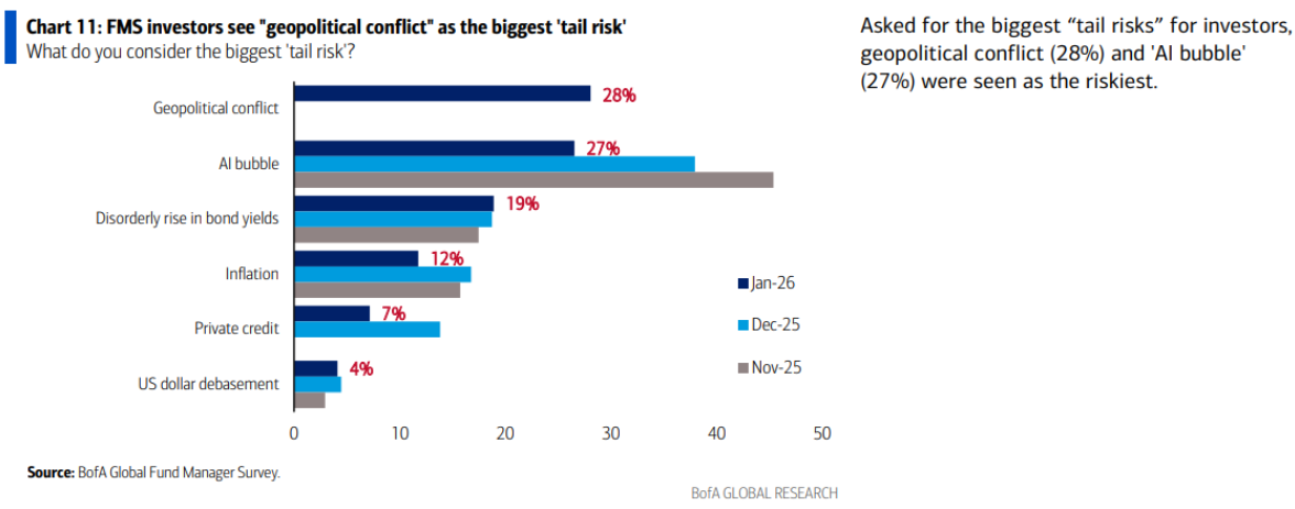 Jeśli chodzi o ryzyka, to w ocenie zarządzających największym jest geopolityka, która wyprzedziła bańkę spekulacyjną na rynku sztucznej inteligencji, i to mimo że badanie przeprowadzono między 8 a 15 stycznia, zanim prezydent USA Donald Trump zagroził podniesieniem ceł na europejskich sojuszników, dopóki Stany Zjednoczone nie uzyskają pozwolenia na zakup Grenlandii. Trzecie miejsce w tabeli ryzyk zajął niekontrolowany wzrost rentowności obligacji, wyprzedzając inflację.