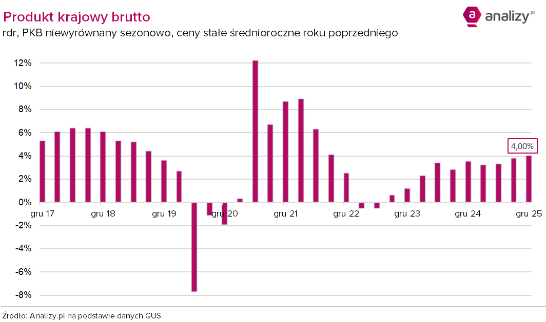 Według szybkiego szacunku produkt krajowy brutto (PKB) niewyrównany sezonowo w 4 kwartale 2025 r. zwiększył realnie się o 4,0% rok do roku wobec wzrostu o 3,5% w analogicznym okresie 2024 r. To odczyt zgodny z prognozami ekonomistów i najwyższy od III kwartału 2022 roku.