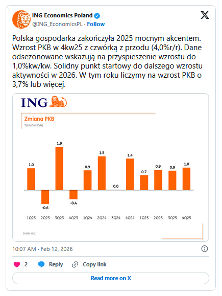 – Polska gospodarka zakończyła 2025 mocnym akcentem. Wzrost PKB w 4 kw. 25 z czwórką z przodu (4,0% r/r). Dane odsezonowane wskazują na przyspieszenie wzrostu do 1,0% kw/kw. Solidny punkt startowy do dalszego wzrostu aktywności w 2026. W tym roku liczymy na wzrost PKB o 3,7% lub więcej – piszą na X-ie ekonomiści ING Banku Śląskiego.