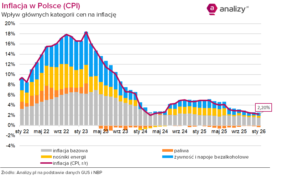 Według wstępnych danych w styczniu 2026 r. ceny towarów i usług konsumpcyjnych wzrosły o 2,2% w porównaniu z analogicznym miesiącem ub. roku, jak podał Główny Urząd Statystyczny.