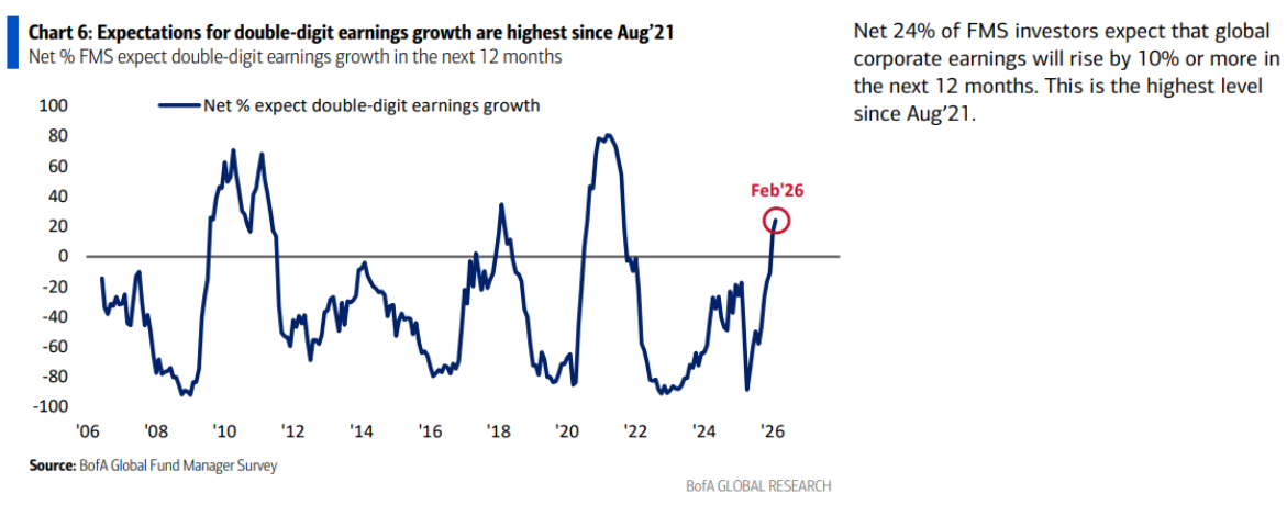 Paradoks polega na tym, że ostrzeżenia o przegrzaniu inwestycji idą w parze z wyjątkowo dobrymi oczekiwaniami co do gospodarki i wyników firm. Uczestnicy badania podnieśli prognozy: scenariusz globalnego „boomu” (ponadtrendowego wzrostu) jest widziany najczęściej od 2022 r., a oczekiwania wzrostu zysków spółek przekraczają 10% – najmocniej od 2021 r.