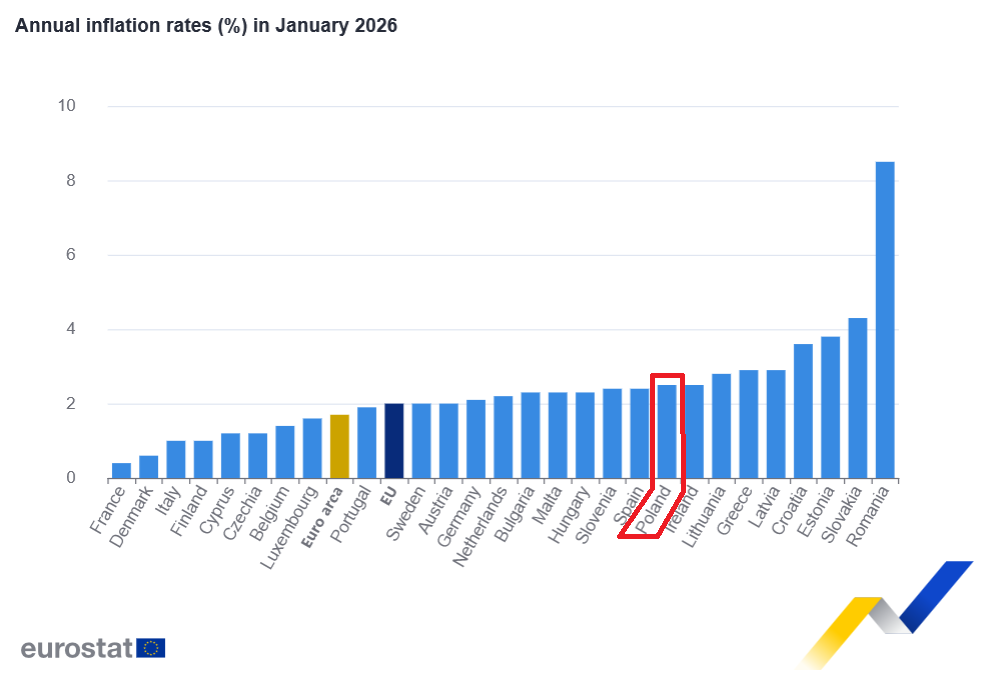 W Polsce odnotowano niewielki spadek z 2,6% w grudniu do 2,5% w styczniu. Sytuuuje to nas na ósmym miejscu w UE ex aequo z Irlandią.