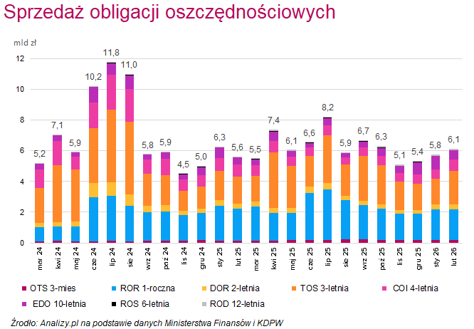 W lutym 2026 r. Polacy najchętniej kupowali obligacje 3-letnie TOS (36% udział w strukturze sprzedaży), nabywcy indywidualni przeznaczyli na ich zakup kwotę 2.189,8 mln zł oraz 1-roczne – ROR (32%) ze sprzedażą na poziomie 1.983,8 mln zł. Mniejszym zainteresowaniem cieszyły obligacje 4-letnie – COI (z 12% udziałem w sprzedaży), 10-letnie – EDO (10%), 2-letnie – DOR (5%), oraz 3-miesięczne – OTS (3%).