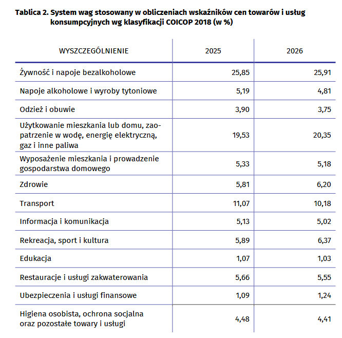 System wag oparty jest na strukturze wydatków gospodarstw domowych na zakup towarów i usług konsumpcyjnych z roku poprzedzającego rok badany (aktualnie jest to 2025 r.), uzyskanej z badania budżetów gospodarstw domowych.