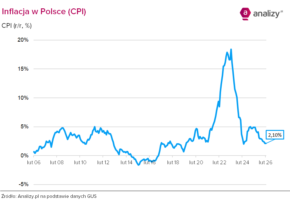 Ceny towarów i usług konsumpcyjnych w lutym 2026 r. w porównaniu z analogicznym miesiącem ub. roku wzrosły o 2,1% (przy wzroście cen usług o 4,8% i towarów o 1,0%). W stosunku do poprzedniego miesiąca ceny towarów i usług wzrosły o 0,3% (w tym usług o 0,7% i towarów o 0,2%).