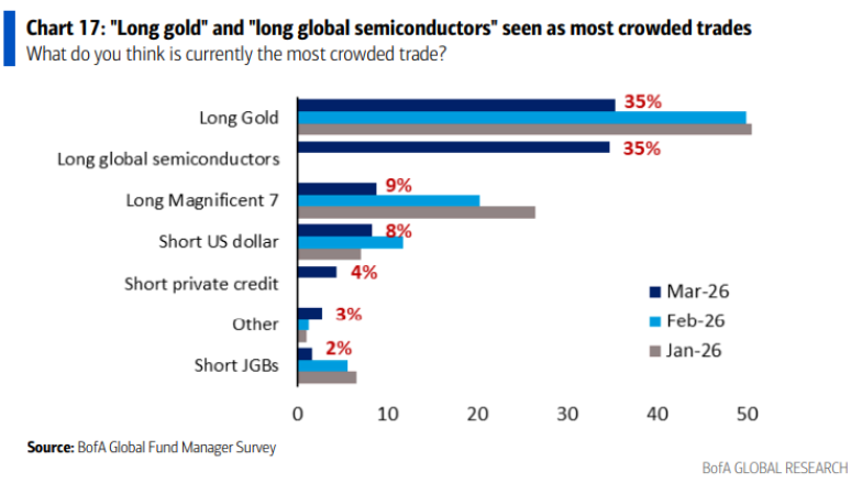 Wśród aktywów cieszących się największym zainteresowaniem inwestorów w marcu znalazły się długa pozycja na złocie ("kupuj"; wyraźnie mniej niż w styczniu i w lutym) oraz zakupy akcji producentów półprzewodników (ex aequo po 35%). Tylko 9% stawiało na aktywa "wielkiej siódemki". Jeszcze w grudniu 2025 r. wskaźnik ten wynosił 54%.