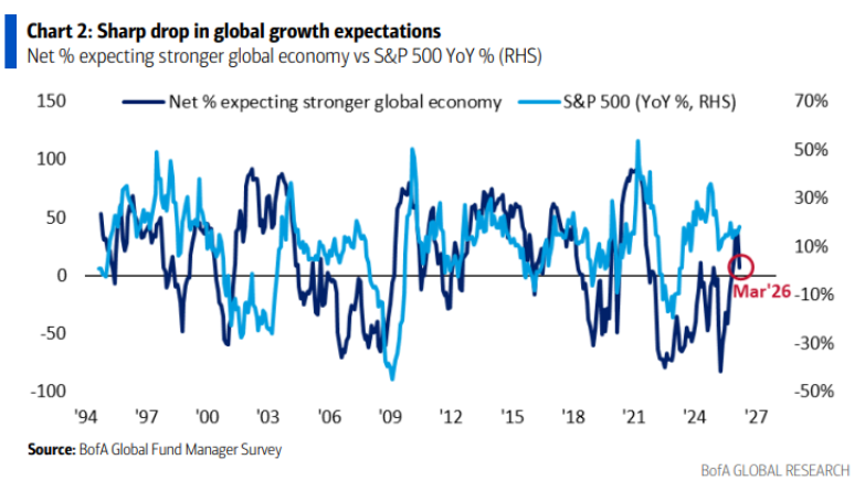 Silne pogorszenie oczekiwań makro marcowy odczyt był jednym z największych miesięcznych zwrotów w stronę pesymizmu od lat. W porównaniu z lutym sentyment przeszedł z euforii w ostrożność. W lutym zarządzający byli opisywani jako „megabyczy”, a netto 39% oczekiwało silniejszego wzrostu gospodarczego w kolejnych 12 miesiącach. W marcu ten odsetek spadł do 7%, a nastroje zeszły do 6-miesięcznego dołka.