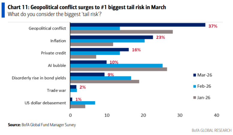 W kategorii "największe ryzyko" sektor związany ze sztuczną inteligencją został wyprzedzony przez geopolitykę i inflację. W lutym głównym „tail risk” była bańka AI / nadmierne wydatki na AI, a obawy o przeinwestowanie były rekordowe. W marcu to miejsce zajęły geopolityka i inflacja, z geopolityką wskazywaną przez 37% respondentów.