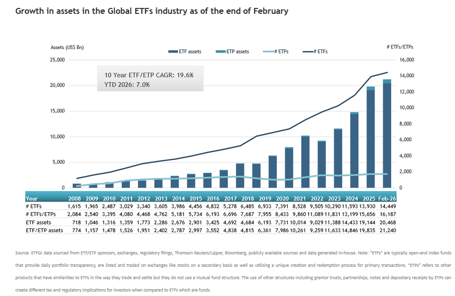 Globalny rynek funduszy ETF kontynuuje dynamiczny wzrost. Jak wynika z najnowszego raportu ETFGI, wartość aktywów zgromadzonych w ETF-ach na świecie osiągnęła na koniec lutego 2026 r. rekordowe 21,24 bln dol.