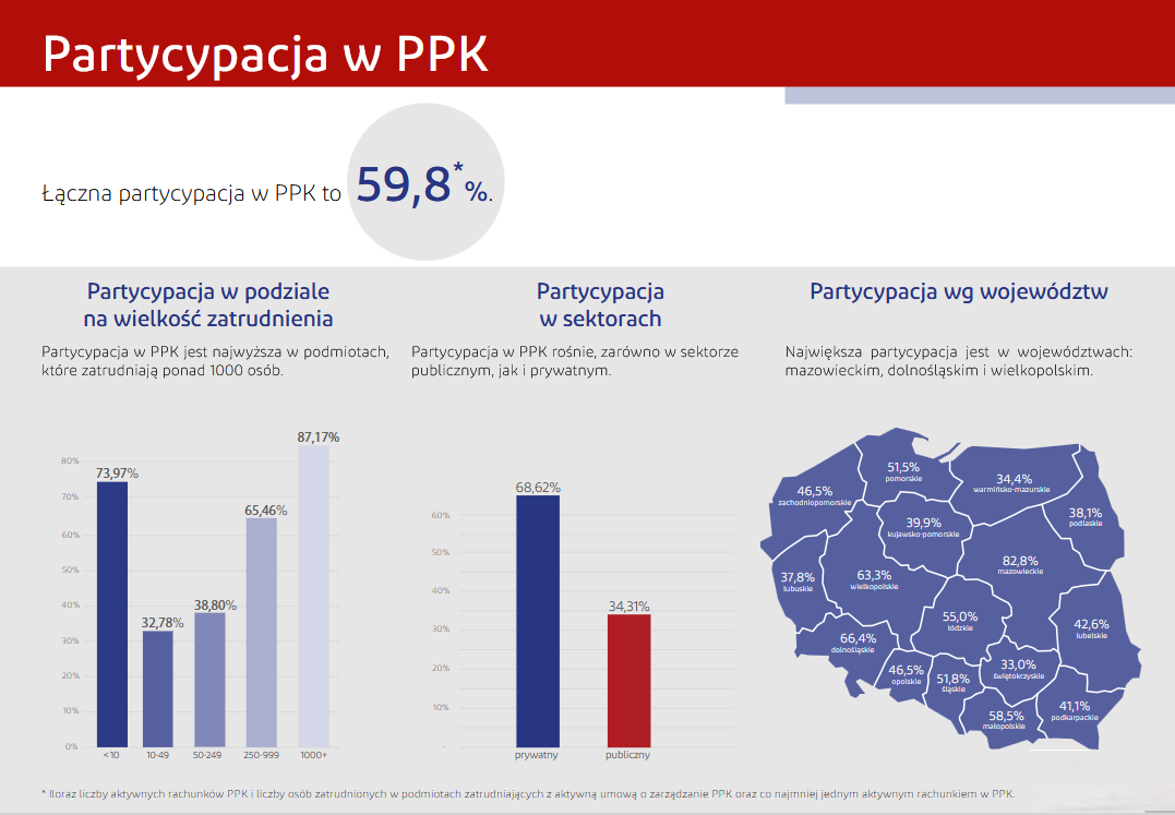 W podziale na wielkość firm największą frekwencją cieszą się PPK w firmach zatrudniających 1 tys. i więcej osób: 87,2%. Na drugim miejscu znalazły się przedsiębiorstwa o liczbie do 10 pracowników (prawie 74%).