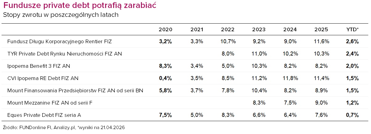 Fundusze private debt udzielają firmom finansowania, które stanowi de facto alternatywę dla kredytu bankowego lub emisji papierów na rynku publicznym. Z takiego finansowania korzystają zwykle mniejsze firmy, często obarczone wyższym ryzykiem niż emitenci obecni na rynku publicznym. W zamian za elastyczność, szybkość i możliwość dopasowania warunków takie firmy są gotowe płacić więcej, co podnosi potencjał stóp zwrotu inwestora. Wynik funduszy private debt jest zwykle oparty na zmiennym oprocentowaniu, najczęściej powiązanym z WIBOR-em, powiększonym o stałą marżę.