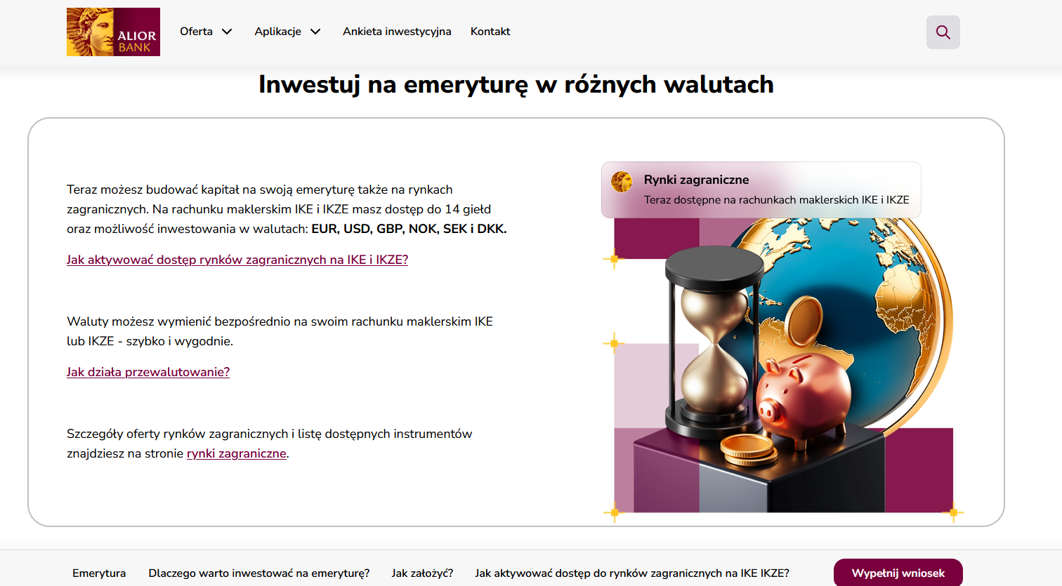 W ramach oferty maklerskiej Alior Banku inwestycje można prowadzić w dolarach amerykańskich (USD), euro (EUR), funtach brytyjskich (GBP), koronach norweskich (NOK), szwedzkich (SEK) i duńskich (DKK), a także w złotych (PLN). Klienci mogą korzystać z bezpłatnych notowań w czasie rzeczywistym z giełd amerykańskich i europejskich. Inwestycje na rynkach zagranicznych dają również możliwość osiągania przychodów z dywidend wypłacanych przez zagraniczne spółki.