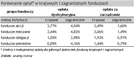 Pomimo wyraźnie niższych opłat za zarządzanie, instytucje zagraniczne mogą pobierać wyższe opłaty dystrybucyjne. Ich poziom jest jednak ustalany przez dystrybutora i może, chociaż nie musi być niższy od opłaty zapisanej w prospekcie. Trzeba również uważać, bo w wielu przypadkach, szczególnie dla funduszy o niskim profilu ryzyka, dystrybutorzy mogą pobierać opłaty na poziomie 4%. Wydaje się, że klienci nie powinni się godzić na tak mało racjonalne i drogie rozwiązanie.