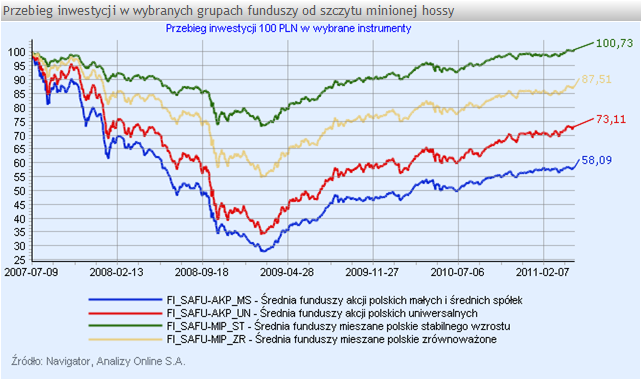 Przykład ten pozwala jednak okreslić maksymalny poziom ryzyka związanego z inwestowaniem w fundusze stabilnego wzrostu. Jest to o tyle istotne, że przed 2007 rokiem mało kto zakładał, że ta grupa rozwiązań inwestycyjnych może wygenerować straty jeżeli okres inwestycji będzie trwał znacznie dłużej niż 12 miesięcy. Niewłaściwe postrzeganie funduszy stabilnego wzrostu polegało głównie na błędnym założeniu, że część dłużna, która w tych produktach zwyczajowo stanowi około 70% portfela, będzie w stanie zamortyzować nawet bardzo wysokie spadki, jakie wygeneruje cześć akcyjna. Kryzys pokazał, że mechanizm ten nie działa w każdych warunkach. Na podstawie minionych doświadczeń można zatem przyjąć, że przejściowy spadek zainwestowanego kapitału (dla wpłaty jednorazowej) w grupie funduszy stabilnego wzrostu może nawet sięgnąć -26%. Jednocześnie historia pokazuje, że w przypadku czarnego scenariusza okres inwestycji, w którym ta grupa produktów nigdy nie poniosła straty to 45 miesiący.