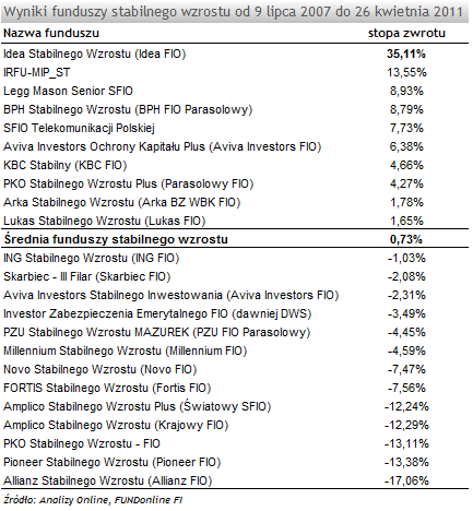 Chociaż fakt ustanowienia nowych szczytów przez średnią funduszy stabilnego wzorstu jest warty odnotowania, to pamiętajmy, że wyniki uzyskiwane w tej grupie produktów sa bardzo zróżnicowane. Dobrze widać to zestawiająć najgorszy uzyskany wynik z tym najlepszym. Od końca minionej bessy najlepszy wynik (+35%) w grupie funduszy stabilnego wzorstu uzyskał fundusz Idea Stabilnego Wzorstu, a najgorszy (-17%) Allianz Stabilnego Wzrostu. Różnica to aż 52 punkty procentowe.
