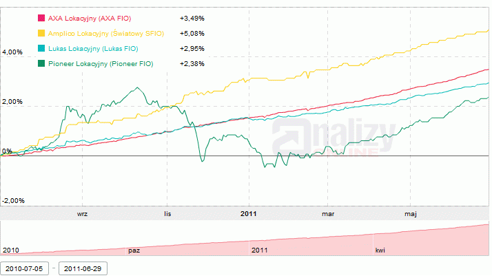 Z kolei najstarsze z rozwiązań, czyli utworzony niemal 6 lat temu Pioneer Lokacyjny to klasyczny fundusz papierów dłużnych złotówkowych. Zarządzający nim od maja 2009 Hubert Kmiecik wybiera do portfela papiery wartościowe emitowane przez podmioty posiadające wysoką ocenę wiarygodności kredytowej. Publikowane ostatnio sprawozdania pokazują, że mimo mocniejszego wejścia na rynek papierów komercyjnych, nadal około 80% portfela stanowią obligacje skarbowe. Na przestrzeni 2010 roku zarządzający utrzymywał wysoką wrażliwość na zmiany stóp procentowych, co przy ich wzroście wpłynęło na bardzo słabe wyniki - zysk na poziomie 3,6% dał funduszowi Pioneer Lokacyjny 18 miejsce na 20 rozwiązań w grupie.