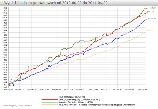 Bardzo dobrym funduszem jest UniKorona Pieniężny (UniFundusze FIO), który od lat plasuje się w czołówkach rankingów. W tym przypadku do rozpoczęcia inwestycji wystarczy 100 zł. To rozwiązanie wyróżnia się aktywnym podejściem inwestycyjnym -zarządzający dopasowują strategię funduszu do bieżącej sytuacji rynkowej nierzadko wyprzedzając trendy. Umiejętnie wykorzystują również dźwignię finansową, co pozwala im zwiększyć zyski, choć zarazem obniża jego bezpieczeństwo. Zaletą funduszu jest stabilny zespół zarządzających, co zwiększa prawdopodobieństwo powtarzalności dobrych wyników. Od 2006 r. zarządza nim Andrzej Czarnecki. Wcześniej funduszem kierował Dariusz Lasek, który obecnie jest szefem zespołu zarządzania instrumentami dłużnymi w Union Investment TFI. Portfel funduszu zarządzający oparli przede wszystkim na obligacjach skarbowych o stałym oprocentowaniu (69,9% na koniec maja 2011 r.). Ryzyko w tym funduszu jest zmienne, ponieważ zależy od składu portfela, który jest dostosowywany do sytuacji na rynku. W ciągu 12 miesiecy zarządzający zarobili dla swoich klientów +5,8%, a po 3 latach +21%.