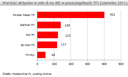 Nie wszystkie TFI, które mogą pochwalić się dużymi aktywami zgromadzonymi na IKE są już zdecydowane wdrożyć nowe rozwiązanie. Z TFI, które zgromadziły na IKE (dane na koniec czerwca 2011 r.) ponad 100 mln zł tylko Skarbiec TFI na pewno zaproponuje swoim klientom IKZE. Natomiast Pioneer Pekao TFI, na którego konta emerytalne klienci wpłacili blisko 401 mln zł swoją ostateczną decyzję uzależni od opinii dystrybutorów. W BZ WBK TFI (117 mln zł na IKE) oraz w ING TFI (123 mln zł na IKE) trwają jeszcze analizy prawne i ekonomiczne dotyczące tego rozwiązania.