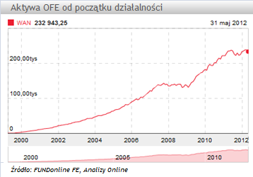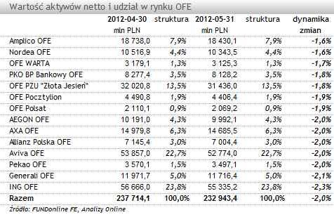 W maju 2012 roku wartość środków zgromadzonych w otwartych funduszy emerytalnych zmniejszyła się o -4,8 mld PLN (-2,0%), do poziomu 232,9 mld PLN. Oznacza to drugi z rzędu spadek w ujęciu miesięcznym, zaraz po kwietniu, kiedy to dynamika zmian wyniosła -0,1%. W sumie, od początku roku, wartość aktywów OFE wzrosła o +3,7%.