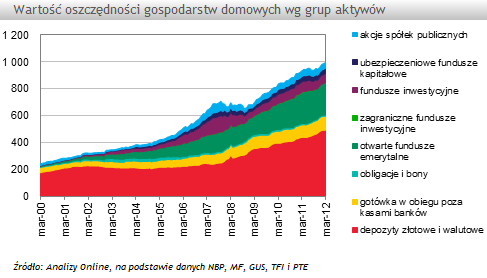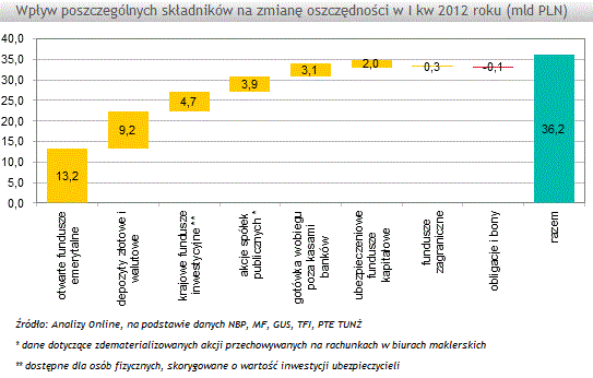 W pierwszym kwartale 2012 r., wzrosły niemal wszystkie składowe struktury oszczędności gospodarstw domowych, za wyjątkiem obligacji i bonów. Największy wpływ na przyrost środków Polaków przeznaczonych na przyszłą konsumpcję miały otwarte fundusze emerytalne. Ich wartość wzrosła w sumie o +13,2 mld PLN, czyli o +3,5%. Ostatni raz aktywa OFE zanotowały większą dynamikę przyrostu dopiero w III kw. 2010 roku, kiedy wyniosła +8,4%. Tak duży przyrost aktywów był możliwy głównie dzięki korzystnym wynikom inwestycyjnym OFE. W styczniu na globalne rynki akcji, w tym również na GPW, powrócił optymizm wśród inwestorów, który napędzał wzrosty indeksów w kolejnych miesiącach. Rynkom pomogły m.in. operacje płynnościowe przeprowadzone przez Europejski Bank Centralny, czy deklaracja FED-u o utrzymaniu niskich stóp procentowych do końca 2014 roku. W efekcie w całym I kw. 2012 r. wartość indeksu WIG zyskała na wartości aż blisko +10%. Ponadto zarządzającym OFE sprzyjała także pozytywna koniunktura na rynku obligacji skarbowych, gdzie wartość indeksu IROS wzrosła o +2,4%. Z kolei drugi z czynników wpływających na wzrost aktywów OFE, tj. przelewy do funduszy z ZUS-u, powiększył stan drugofilarowych środków o +2,1 mld zł. To blisko 3-krotnie mniej niż w analogicznym okresie 2011 roku, co jest pokłosiem zeszłorocznego obniżenia składki płynącej do funduszy emerytalnych.