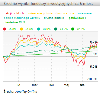 W czerwcu, z blisko 600 funduszy, ponad 80% osiągnęło dodatnią stopę zwrotu. W horyzoncie 6-miesięcznym ponad 85%. Najwięcej można było zarobić na funduszach inwestujących w regiony Środkowej i Wschodniej Europy, w szczególności w Turcji (Arka BZ WBK Akcji Tureckich +12%, Investor Turcja +10,9%, Quercus Bałkany i Turcja +9,3%). Dobrze było też na rodzimym rynku. Wszystkie fundusze akcji polskich uniwersalnych zanotowały w czerwcu dodatnią stopę zwrotu. Mimo to, wynik lepszy od WIGu zanotowały tylko trzy fundusze: Pioneer Akcji Aktywna Selekcja +8,9%, Skarbiec Akcji +8,7% i Investor Akcji Dużych Spółek +8,1%. Od początku roku najlepiej radzi sobie Copernicus Akcji Dywidendowych (+23,9%). W czerwcu, spółki o małej i średniej kapitalizacji radziły sobie słabiej niż duże spółki (mWIG40 zarobił 2,44%, a sWIG80 +2,52%). W takich warunkach fundusze akcji małych i średnich spółek osiągnęły nieco niższe stopy zwrotu niż fundusze akcji polskich uniwersalnych (średnia +3,0%) ale i tak wszystkie zakończyły miesiąc na plusie. Najwięcej zyskał fundusz Millennium Dynamicznych Spółek +3,7%, najmniej Investor Top 25 Małych Spółek FIO +1,3%.