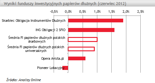 Bardzo dobre wyniki, choć w większości przypadków niższe od IROSu (+1,18%), zanotowały fundusze polskie papierów dłużnych (średnio +1%). Stopy zwrotu, jakie osiągnęły w ostatnim półroczu fundusze dłużne polskie papierów skarbowych to najlepszy wynik na rynku od 3,5 lat. W 2012 roku zyskały na wartości średnio +4,2%. Najwięcej od początku roku można było zarobić inwestując w fundusze Ipopema Obligacji +6,1% i ING Obligacji 2 SFIO +5,6%, natomiast w czerwcu najlepszy wynik osiągnął Skarbiec Obligacji Instrumentów Dłużnych+1,9%.