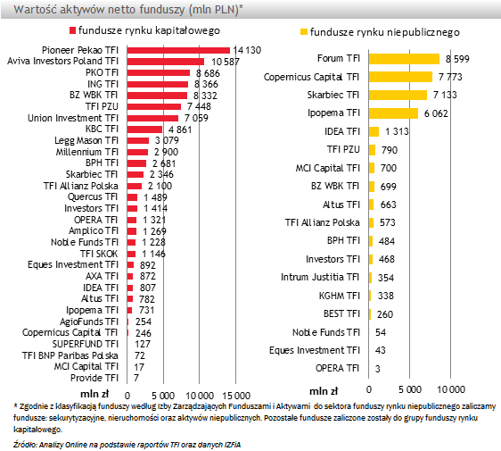 Od początku roku wartość zarządzanych aktywów wzrosła o ponad +16,6 mld zł. W tym czasie rosły aktywa w czterech segmentach rynku funduszy, w tym w największym stopniu funduszy dłużnych i aktywów niepublicznych, odpowiednio o +8,4 mld zł i +7,3 mld zł. Warto jednak podkreślić, że także fundusze akcyjne zwiększyły aktywa o ponad +1,2 mld zł pomimo tego, że od początku roku ich klienci wypłacili więcej środków niż wpłacili.
