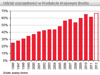 W 2012 roku wyraźnie poprawiła się relacja oszczędności gospodarstw domowych do PKB. Na koniec grudnia 2012 roku ich udział w produkcie krajowym brutto wzrósł o blisko 5 pkt proc. do poziomu 66,5%. Co prawda w Polsce ta wartość jest wciąż relatywnie wysoka, to w przypadku rozwiniętych gospodarek europejskich, wskaźnik ten osiąga kilkukrotnie wyższe wartości.