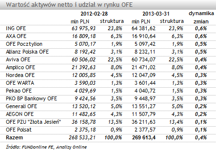 W minionym miesiącu jednostki funduszy emerytalnych straciły na wartości średnio -0,2%. Jako jedyne zyski wypracowały ING OFE - posiadające największy udział w rynku oraz AXA OFE i to te fundusze w największym stopniu zwiększyły wartość zarządzanych środków (oba o +0,6%). Drugi co do wielkości fundusz - Aviva OFE, powiększył stan aktywów o +0,4% do 60,7 mld zł. Najmniejszy wzrost aktywów odnotował trzeci co do wielkości fundusz - OFE PZU "Złota Jesień" oraz najmniejszy - OFE Polsat, fundusz, którego jednostka najwięcej straciła na wartości w marcu -0,6%.