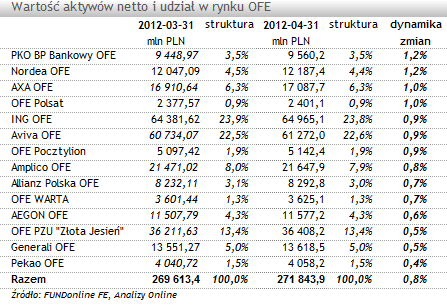 W kwietniu drugi raz z rzędu wzrosła wartość aktywów OFE. Środki zgromadzone w funduszach emerytalnych wzrosły w minionym miesiącu o ponad +2,2 mld zł do 271,8 mld zł. Dzięki temu miesięczna dynamika zmian była najwyższa w tym roku i wyniosła +0,8%.
