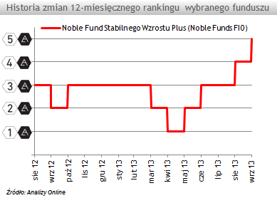 We wrześniu do grona funduszy z najwyższą notą 5a w horyzoncie 12-miesięcznym awansował także Noble Fund Stabilnego Wzrostu Plus, który jeszcze kilka miesięcy temu otrzymał w tym zestawieniu najniższą notę - 1a. Jest to jedno z najmniejszych rozwiązań w grupie i zarazem jedno z bardziej ryzykownych. W ostatnich miesiącach podjęte ryzyko się opłaciło, osiągnięty w 12 mies. wynik jest najwyższy w grupie (+13,8%) liczącej blisko 30 funduszy. Jeśli nadwyżka nad średnią zostanie utrzymana, również nota 36-miesięczna ma szansę na poprawę. Obecnie jest na poziomie przeciętnym (3a).