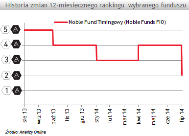 Z zupełnie inną sytuacją mieliśmy do czynienia w przypadku Noble Fund Timingowego. Jeszcze miesiąc temu fundusz mógł pochwalić się wysoką oceną w 12-miesięcznym rankingu (4a), w lipcu odnotował spadek aż o dwie noty, do poziomu 2a. Jego jednostka w ciągu ostatniego roku traciła mocniej od średniej w grupie funduszy aktywnej alokacji, w okresach silnej przeceny na GPW. Mogło to wynikać z dużego zaangażowania na rynku akcji. Udział bardziej ryzykownych instrumentów w portfelu Noble Fund Timingowego został zwiększony w ostatnich miesiącach i należy do najwyższych wśród konkurentów (ponad 75%).