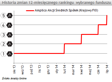 Wśród najciekawszych zmian w lipcowym rankingu warto zwrócić uwagę na znaczny wzrost oceny w 12-miesięcznym rankingu Amplico Akcji Średnich Spółek (Krajowy FIO). Jeszcze w lutym tego roku fundusz nie wyróżniał się na tle konkurencji. Większa efektywność w ostatnich miesiącach wynikała z konstrukcji portfela, opartego głównie na spółkach o średniej kapitalizacji. W tym roku przedstawiciele dawnego indeksu mWIG40 spisują się znacznie lepiej w porównaniu do segmentu małych spółek z GPW. Dlatego też fundusze z dużym udział średnich spółek w portfelu zajmują czołowe lokaty w grupie akcji MiŚS.