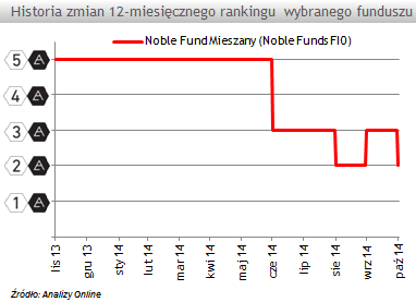 Z zupełnie inną sytuacją mieliśmy do czynienia w przypadku Noble Fund Mieszanego. Od października 2012 r. do maja 2014 r. fundusz utrzymywał najwyższą notę w krótkoterminowym rankingu 5a. W tym czasie niemal w każdym miesiącu zdołał osiągać wyniki lepsze od średniej, przy niskim poziomie ryzyka. Sytuacja uległa zmianie już w tym roku, kiedy to wyniki funduszu na słabszym rynku były już wyraźnie niższe od konkurencji. W efekcie ocena w 12-miesięcznym rankingu funduszy od maja br. zanotowała spadek z 5a do 2a. Duża zmienność wyników to efekt założeń polityki inwestycyjnej, która bazuje na modelu alokacji aktywów w cyklu koniunkturalnym. W przypadku dobrych danych makroekonomicznych zarządzający utrzymują wysokie (nawet do 80% aktywów) zaangażowanie w akcje, niezależnie od kondycji giełdowych indeksów. W tym roku mieliśmy natomiast do czynienia z dobrymi danymi makro z polskiej gospodarki, przy jednoczesnej korekcie na GPW wywołanej głównie czynnikami geopolitycznymi.