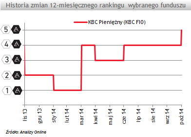 Wśród najciekawszych zmian w październikowym rankingu warto zwrócić uwagę na poprawę oceny KBC Pieniężnego (KBC FIO) do najwyższego poziomu 5a. Jeszcze na początku tego roku nota w krótkoterminowym rankingu funduszu spadła do najniższej 1a. Fundusz przez większość 2012 i 2013 r. otrzymywał niskie oceny, co częściowo było spowodowane osłabieniem wyników w związku z odpisami na problematyczne obligacje PBG. Od drugiej połowy 2013 r. zarządzający KBC Pieniężnego zmieniali skład portfela. Ograniczono udział bardziej ryzykownych obligacji przedsiębiorstw na rzecz papierów komunalnych i skarbowych, co wpłynęło pozytywnie na relację zysku do ryzyka. Od marca do października br. ocena w 12-miesięcznym rankingu zdołała wzrosnąć aż o 4 noty do 5a. W ciągu ostatnich 3 miesięcy fundusz regularnie osiągał wyniki wyższe od średniej w grupie rozwiązań gotówkowych i pieniężnych.