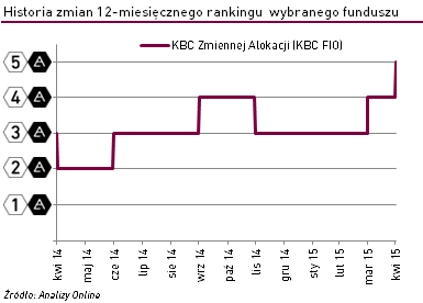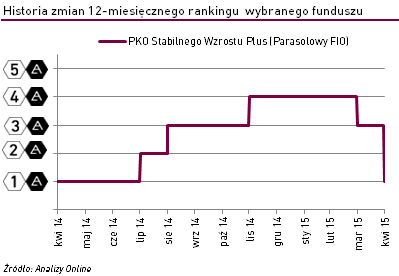Początek 2015 roku okazał się natomiast trudny dla PKO Stabilnego Wzrostu Plus. Od stycznia stopy zwrotu funduszu wyraźnie odstają od konkurentów. Chociaż przeciętny wynik rywali w lutym, marcu i kwietniu był dodatni, produkt PKO TFI przyniósł straty. W efekcie ucierpiała na tym efektywność mierzona wskaźnikiem information ratio. Jeszcze w lutym 12-miesięczna ocena w rankingu była na poziomie 4a. Po kwietniu nastąpił jednak diametralny spadek do najniższego - 1a.
