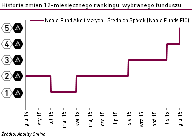 W tym miesiącu wśród wszystkich kategorii produktów zwróciliśmy uwagę na fundusz Noble Fund Akcji Małych i Średnich Spółek (Noble Funds FIO). Po dłuższej przerwie powrócił do grona najwyżej ocenionych funduszy. W grudniowym Rankingu otrzymał ocenę (5a) w 12-miesięcznym horyzoncie. Fundusz ten systematycznie poprawia swoją notę. Jeszcze w marcu tego roku należał do grona najsłabszych w swojej kategorii. Obecnie plasuje się na pierwszym miejscu osiągając +11,8% zysku w skali roku. Na dobre wyniki wpływ miała dobra koniunktura na rynku zwłaszcza małych i średnich spółek. Indeks sWIG80 wzrósł w tym czasie o ponad +9%. Kluczem do sukcesu była również właściwa selekcja średnich spółek, która pomimo wzrostu indeksu o +2,4% pozwoliła na osiągnięcie ponadprzeciętnej stopy zwrotu.