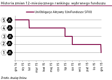 W odwrotnej sytuacji znalazło się Union Investment TFI. Cztery fundusze tego towarzystwa otrzymały najniższą ocenę 1a, a kolejnym czterem, w porównaniu do listopada, obniżono notę. Funduszem, który wpisuje się w ten schemat jest UniObligacje Aktywny (UniFundusze SFIO), który w grudniu otrzymał notę 1a. Ten jeden z najciekawszych funduszy dłużnych na rynku, wysoko oceniony przez naszych analityków w Ratingu Analiz Online, ma za sobą słaby rok. Skończył go z wynikiem -1,0%. Zarządzający inwestuje bardzo aktywnie, poszukując dodatkowej stopy zwrotu. Często odważne zakłady pozwalają na zdystansowanie konkurencji, jak choćby w 2014 roku. Oczywiście każdy medal ma dwie strony – zdarzają się również takie okresy, gdy portfel subfunduszu traci więcej niż konkurencja. W 2015 roku zarządzający szukając wyższego dochodu inwestował m.in. w obligacje tureckie oraz węgierskie, a także papiery komercyjne. Ostatecznie jednak otoczenie rynkowe okazało się mniej sprzyjające od założeń.