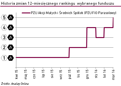 Wśród funduszy, które systematycznie poprawiają swoje oceny w krótkoterminowym rankingu, warto zwrócić uwagę na PZU Akcji Małych i Średnich Spółek (PZU FIO Parasolowy). W marcu ocena tego produktu wzrosła z 4a do 5a. Natomiast jeszcze w październiku 2015 r. znajdowała się na poziomie 1a. W połowie 2015 r., po zmianie zarządzającego, w większym stopniu postawiono na selekcję w funduszu, niż replikację portfeli konkurencji. Jednocześnie ograniczono liczbę pozycji (z 250 na koniec 2013 r do 160 na koniec czerwca 2015 r.). W portfelu PZU Akcji Małych i Średnich Spółek (PZU FIO Parasolowy) dużą rolę w porównaniu do konkurencyjnych rozwiązań, odgrywają spółki o niskiej kapitalizacji spoza indeksu sWIG80, co mogło sprzyjać wynikom pod koniec 2015 r. i na początku 2016 r. W ciągu ostatnich 6 miesięcy PZU Akcji Małych i Średnich Spółek (PZU FIO Parasolowy) 4-krotnie osiągał stopy zwrotu wyższe od średniej w grupie.