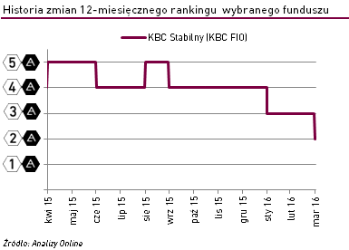 Z odwrotną sytuacją – czyli spadkiem efektywności mieliśmy do czynienia w przypadku funduszu mieszanego KBC Stabilny (KBC FIO). Przez cały 2015 r. rozwiązanie utrzymywało wysokie oceny w krótkoterminowym Rankingu (5a lub 4a). Początek obecnego roku przyniósł pogorszenie relacji zysku do ryzyka i w efekcie spadek noty do poziomu 2a. W ostatnich okresach sprawozdawczych zarządzający funduszem stopniowo ograniczali udział dużych spółek w części akcyjnej portfela przy jednoczesnym stosowaniu kontraktów terminowych na spadek indeksu WIG20. To podejście sprawdzało się w przeszłości, ale w tym roku uniemożliwiło pełne wykorzystanie odbicia w segmencie krajowych blue chipów. W grupie stabilnego wzrostu pod względem stóp zwrotu w I kwartale br. wyróżniły się przede wszystkim fundusze, których zarządzający budują portfel akcyjny głównie w oparciu o przedstawicieli indeksu WIG20. Odmienne podejście stosowane w funduszu KBC Stabilny (KBC FIO) mogło przełożyć się na pogorszenie wyników porównaniu do konkurencji.