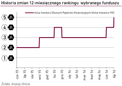 Wśród funduszy, które mogą pochwalić się najwyższym Rankingiem na poziomie 5a, po raz pierwszy od dwóch lat, znalazł się Aviva Investors Dłużnych Papierów Korporacyjnych. Jeszcze w marcu ubiegłego roku fundusz znajdował się wśród 15% najniżej ocenianych rozwiązań. Od tego czasu jego ocena systematycznie rosła, by w lipcu osiągnąć najwyższy poziom. Jednym z głównych powodów są bardzo dobre stopy zwrotu z portfela. Wyniki zarządzania w różnych okresach (trzymiesięcznym, półrocznym czy rocznym) za każdym razem plasują fundusz na podium najbardziej zyskownych rozwiązań w grupie dłużnych polskich korporacyjnych.