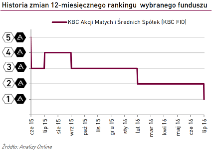 Na drugim biegunie, znalazł się KBC Akcji Małych i Średnich Spółek, który jeszcze w maju ubiegłego roku, w horyzoncie 12-miesięcznym, oceniony był najwyżej w swojej grupie. Po ponad roku od tego czasu, jego Ranking spadł do poziomu 1a. Osiągnięta stopa zwrotu za ostatnie 12 miesięcy (-7,3% w porównaniu do średniej w grupie MiŚ -3,4%) plasuje fundusz w ogonie grupy. Znacznie lepiej wypada jednak w Rankingu długoterminowym. W tym wypadku systematycznie osiąga notę 4a lub 5a.